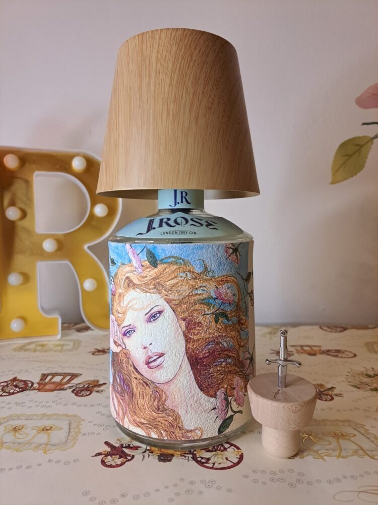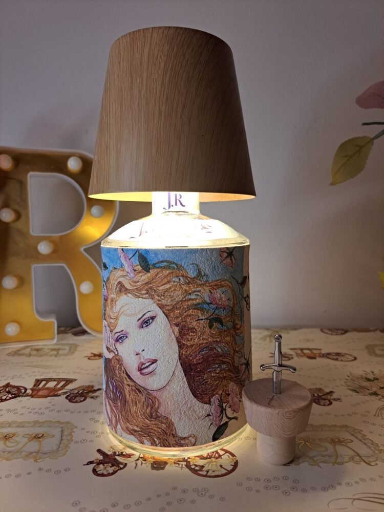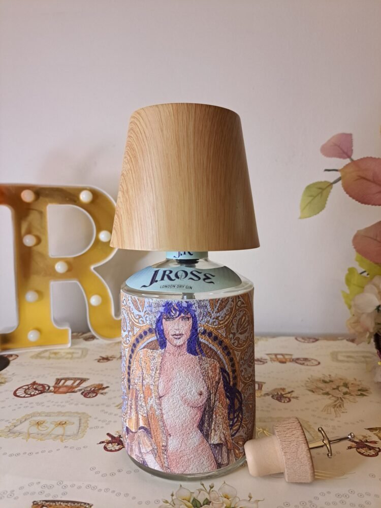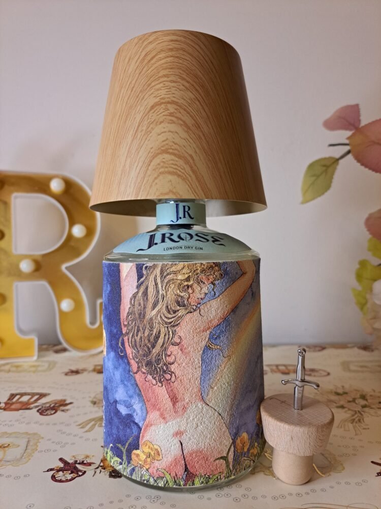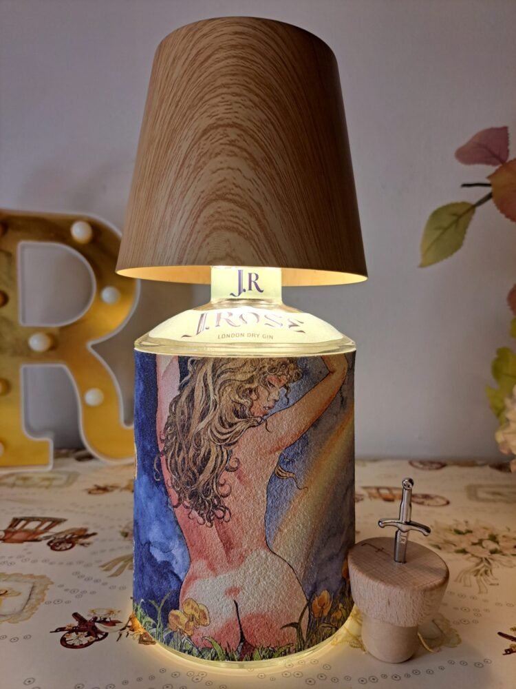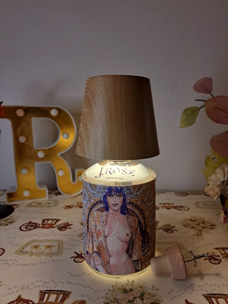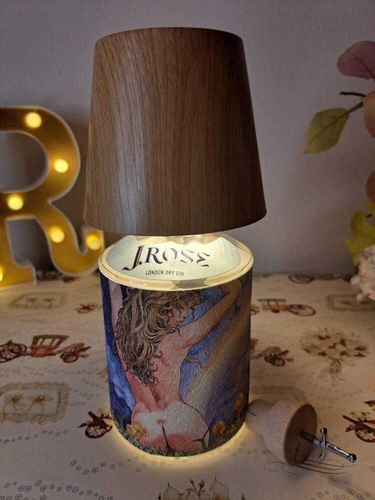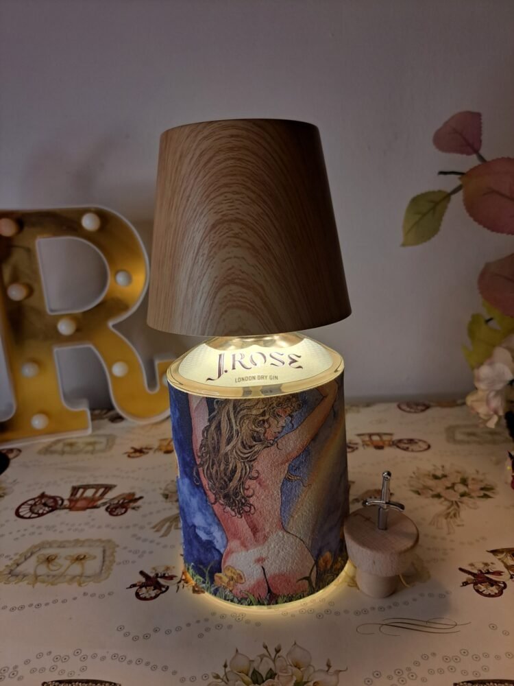 Questa lampada non ha necessità di essere collegata alla rete elettrica, il paralume color legno chiaro (possibilità di altri colori) funge da lampadina dimmerabile (diverse gradazioni di colore), il cavo di ricarica è incluso. Bottiglia di gin J.Rose inclusa, chiamare o inviare mail per scegliere il tema dell’etichetta e il paralume . Le piccole imperfezioni che potrebbero comparire sono dovute al materiale recuperato e riciclato, imperfezioni che donano all’oggetto l’unicità che merita ognuno di questi pezzi.